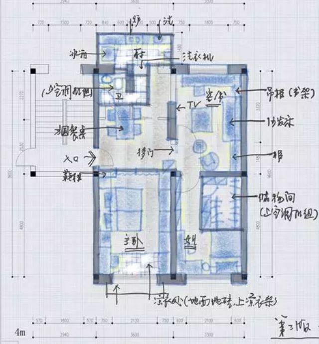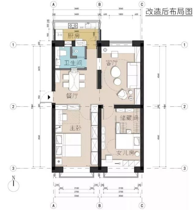 ?陽光具有非常好的殺菌功能,小孩特別需要陽光照明,現(xiàn)在做功課都是背光的,從格局上把女兒房換到南面。原狀客廳的位置改為主臥,主臥改為女兒房,兩個(gè)臥室都南向設(shè)置。