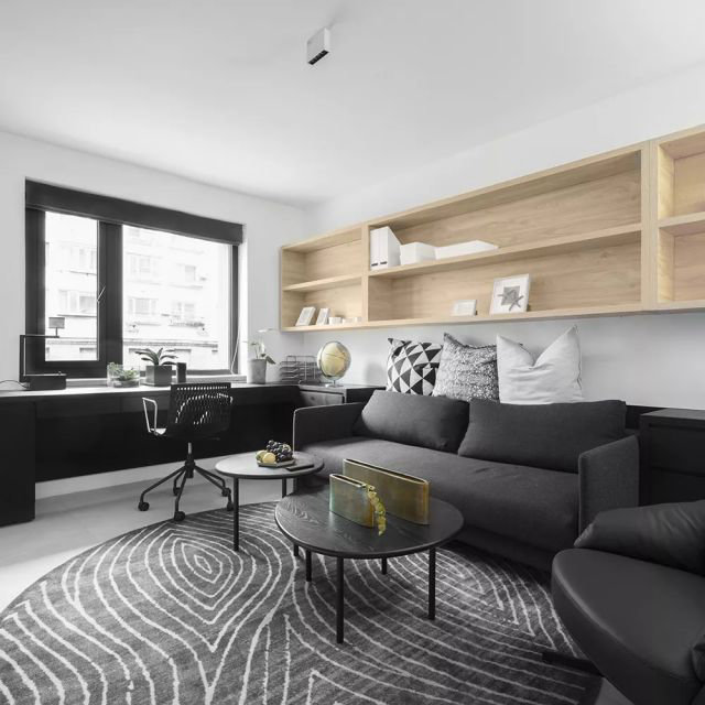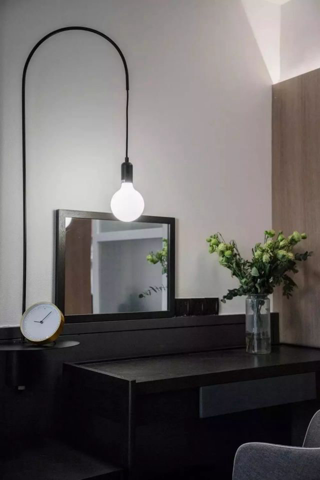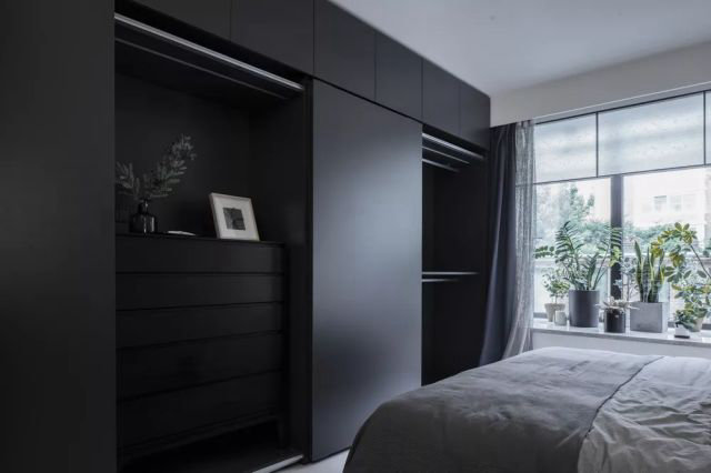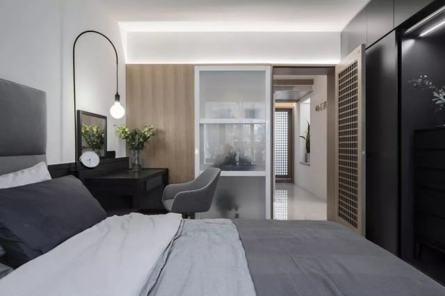 主臥室的空間是原有的客廳,這樣就保證了兩個(gè)臥室都“坐北朝南”,有足夠的陽光,可以充分?jǐn)z取自然光線,對(duì)一家人的身體健康大有裨益。黑色在五行中代表水,所以軟裝部分用了大量的黑色。