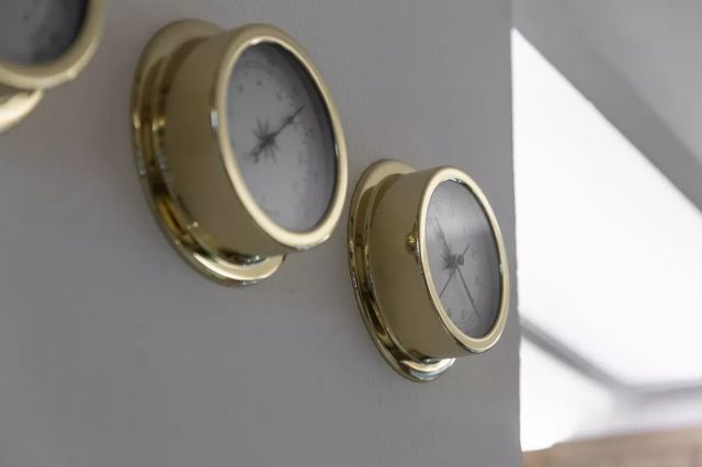 家里所有用的時(shí)鐘和溫濕度鐘都設(shè)計(jì)成了潛水器里儀表盤的形式。?