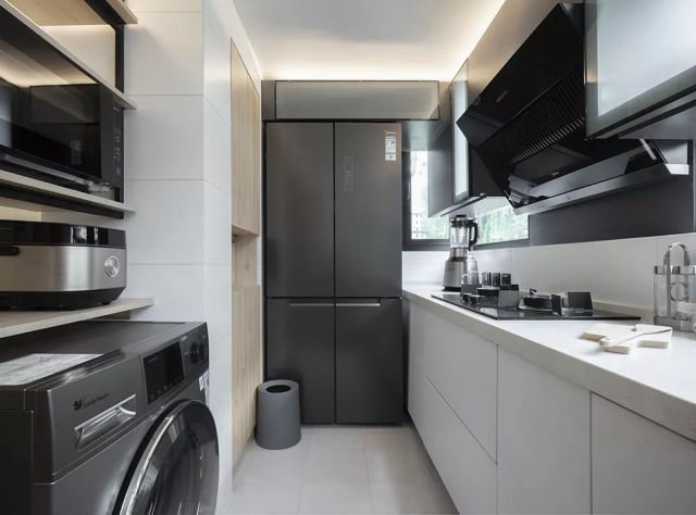 為了打造一個(gè)方便操作,溫度適宜的廚房,宋微建將陽臺(tái)外墻“削薄”,用鋼架和保溫層加固圍合,升高了窗戶的下緣邊界,方便未來的使用與清理。