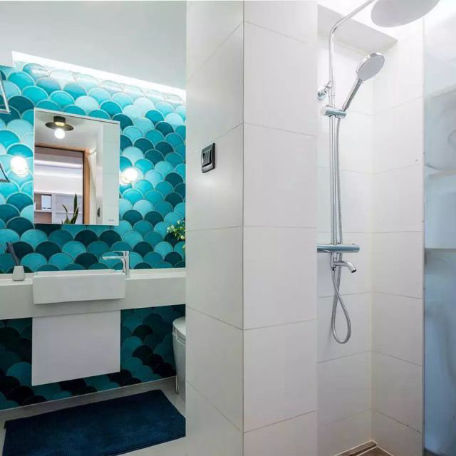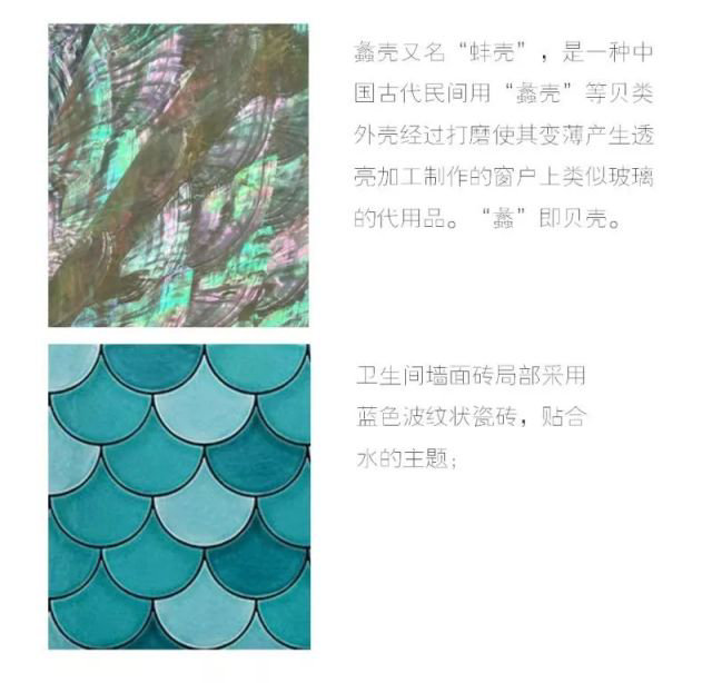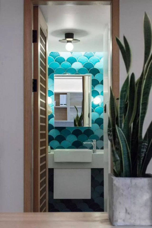 ?深海傳達(dá)著藍(lán)色科技的概念,深海作業(yè)則是一種領(lǐng)航,因此設(shè)計(jì)中和海洋有很多的聯(lián)系。房間內(nèi)不能大量用“水”,所以宋微建用這些方式來體現(xiàn)水元素。藍(lán)色,給人的第一感覺就是水;黑色,在五行中代表水;衛(wèi)生間的深藍(lán)色魚鱗狀瓷磚,餐廳的儀表盤,女兒房的魚缸以及海星掛件,都是與海有關(guān)的布置。