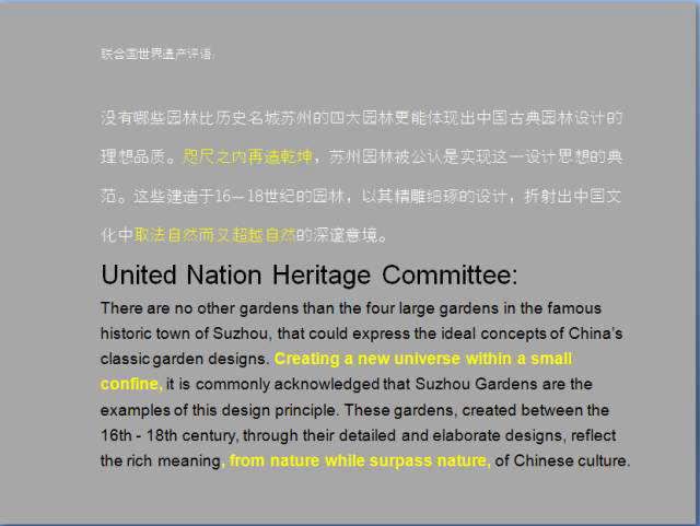 我們看到中國(guó)的經(jīng)濟(jì)崛起,產(chǎn)生了許多暴發(fā)戶,尤其是這種爆發(fā)思想——求大、求高、求上,我們愧對(duì)祖宗。這是世界文化遺產(chǎn)給蘇州園林的評(píng)語(yǔ),其中最重要的兩點(diǎn),一是咫尺之內(nèi)再造乾坤,第二點(diǎn)是取法自然而超越自然。這對(duì)于我們建筑師、設(shè)計(jì)師來(lái)說(shuō),這兩點(diǎn)是我們未來(lái)值得去挖掘的智慧。?