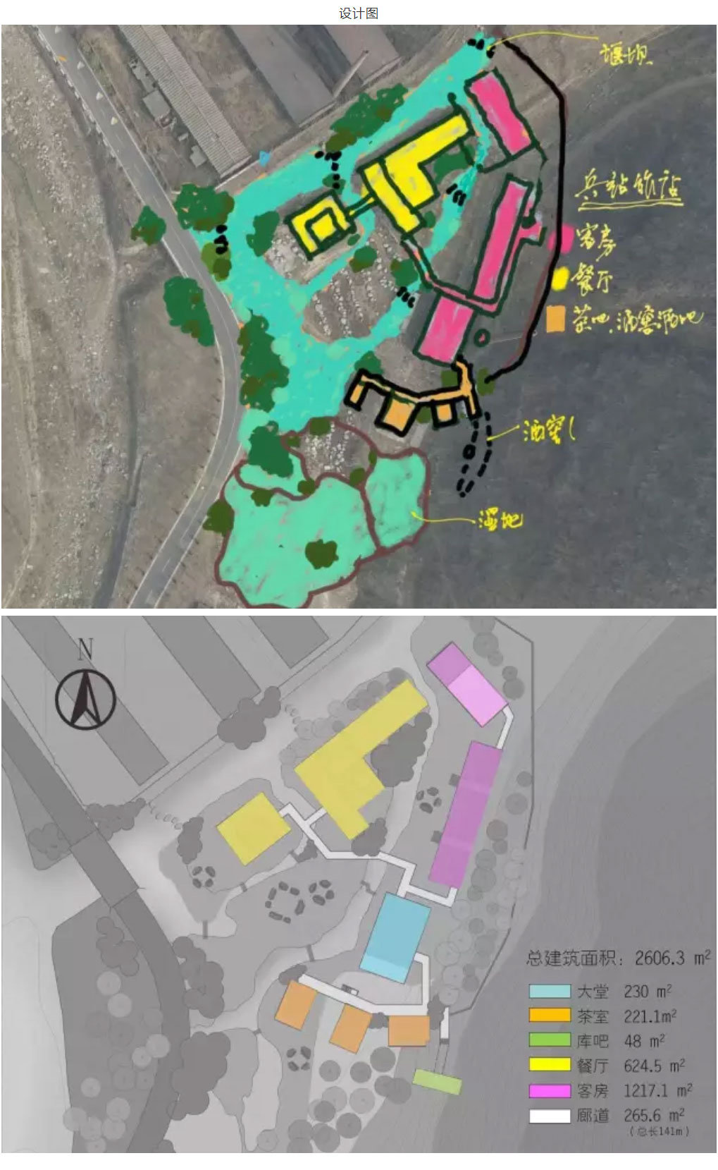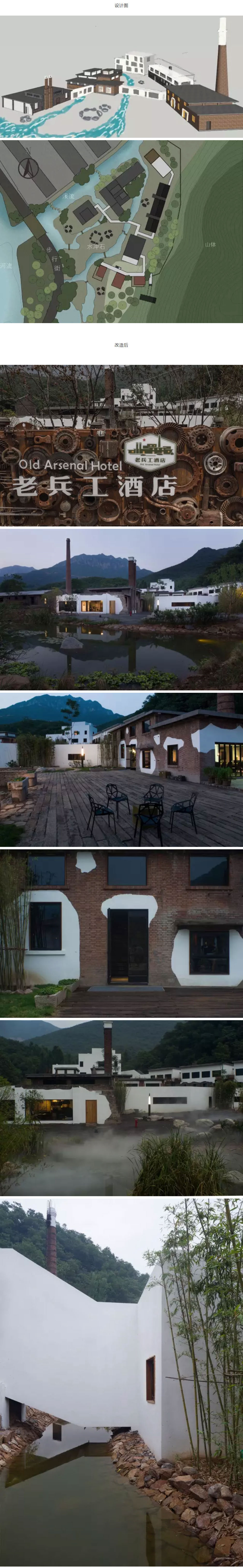 老兵工酒店一期西面靠山,東、南面臨河,總用地面積9423平方米,建筑占地面積2023平方米。 在設計中,將建筑空間重新分割整理,在原有的4棟建筑之間,新建了2棟建筑,并把一個過去藏軍械的山洞也納入其中。