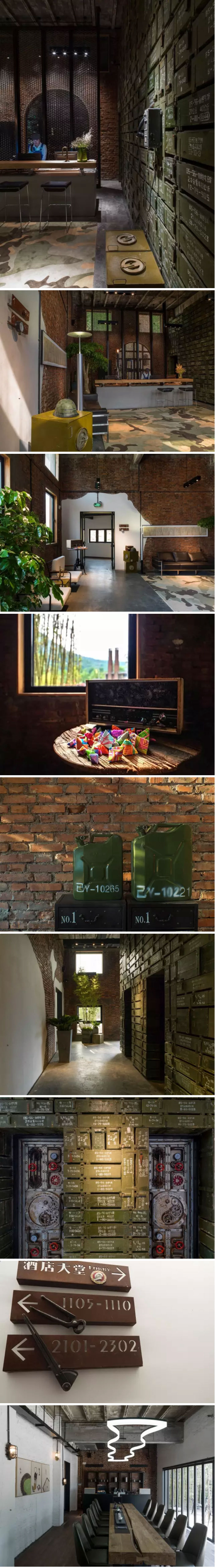大堂入口,整面的彈藥箱筑成的墻體,接待臺的槍臺燈,地上的迷彩地毯,老文件柜,老式壁掛電話機,軍綠鐵皮箱,齒輪儀表標牌,火紅年代的記憶娓娓道來。而鐵鏈組成的黑色屏風、造型簡潔的水泥吧臺、金屬線條的吧臺凳,以低調的姿態將現代、歷史、人融合。