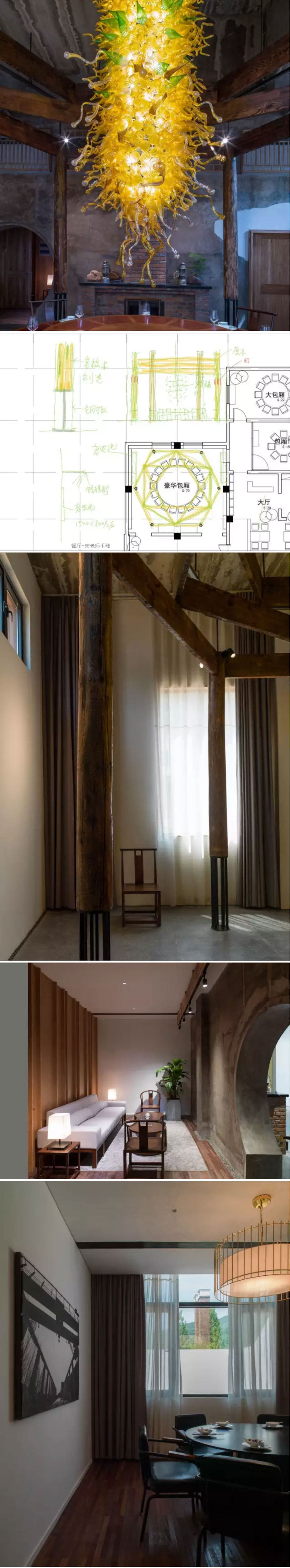 大堂向左走,穿過長廊,來到餐廳。餐廳分為兩個部分,主餐廳區和老灶臺特色餐廳。主餐廳設有包廂大中小各一個,以及散座區。豪華包廂里保留了原始墻面,2.5米高的吊燈,晶瑩剔透,與雄渾的廠房墻面形成強烈的對比,歷史與現代、沉穩與躍動在此碰撞交融。橘黃色的燈光由內而外散射出來,那個年代熱火朝天的生產建設,有了現代的表達。散座區,彈藥箱壘成隔斷將走廊與就餐區隔。墻上,兵工廠的老照片向人們訴說著記憶。