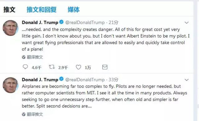 準備此文之際,驚聞埃航空難,157人遇難,罪魁禍首是新近安裝的自動系統,而去年10月間,獅航189人因同樣的原因葬身大海。為此,美國總統發了這則推文:“新飛機不該總往沒必要的方向發展,出現故障的時候,復雜性就催生了危險性。我們不需要愛因斯坦來做飛行員,需要的,是讓飛行員容易掌握、更快掌握的飛機。”?