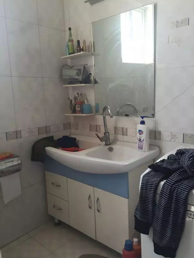 主衛使用隱藏式水箱馬桶,節約空間,增加臺面及儲藏空間;浴簾式淋浴間,節約空間,淋浴間增設晾衣繩,延續原有主人使用習慣,同時也做到了干濕分離。