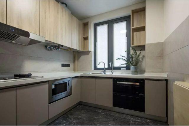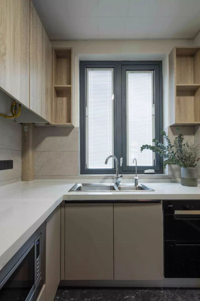 原廚房的收納空間有限,造成許多食品雜物只能亂堆亂放,改造后做了整體櫥柜、吊柜,即滿足更強的儲物功能,又使空間干凈整潔。
