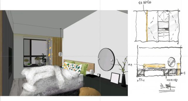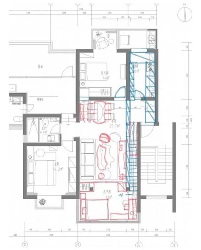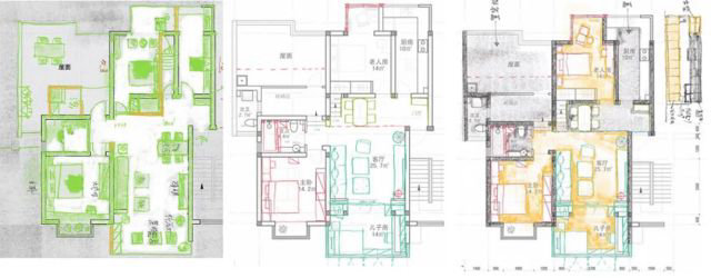 改造后的空間由原來的兩室一廳改為三室一廳,主臥和次臥分別為夫妻房和老人房,增加一間小孩房。