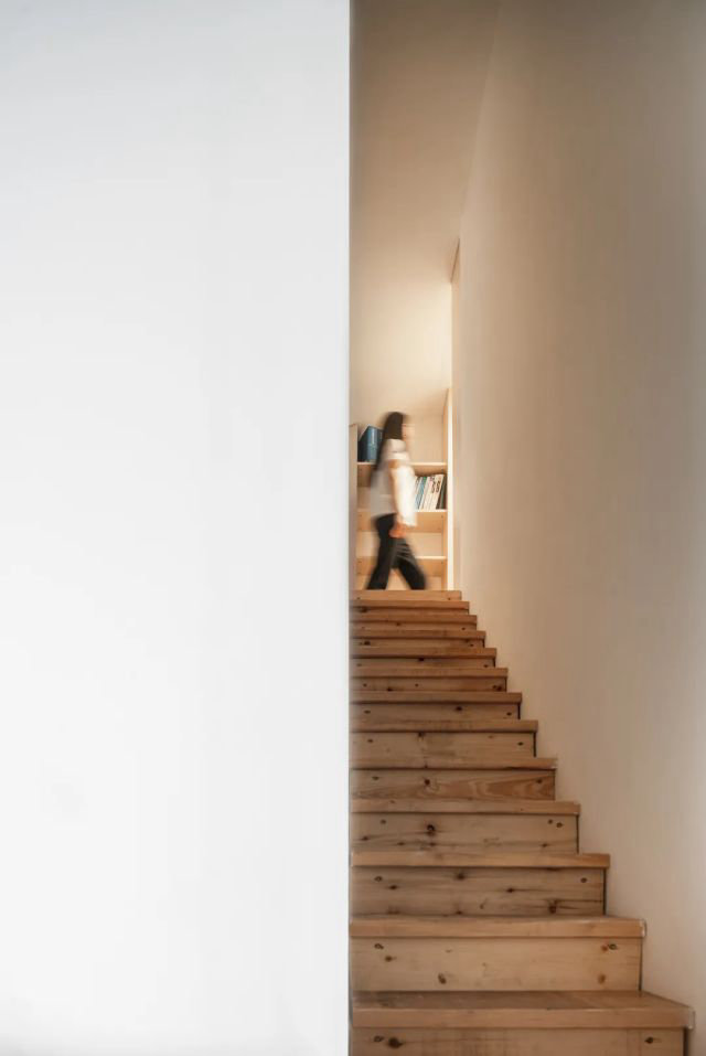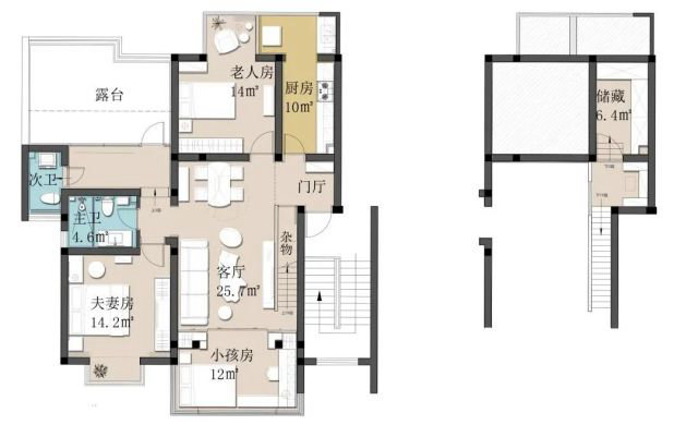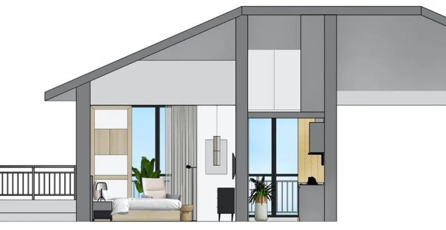利用朝南的陽臺(2.5m進深),隔出一塊獨立的房間,還特別按照正常房間的窗扇處理,完全抹去了陽臺的感覺。廚房和主次衛的位置保持不變,利用屋面坡頂的高度,加建一個閣樓,作為儲藏間使用。原露臺進行翻新,增加雨棚遮擋,主要作為晾曬區使用。