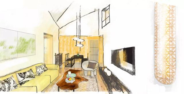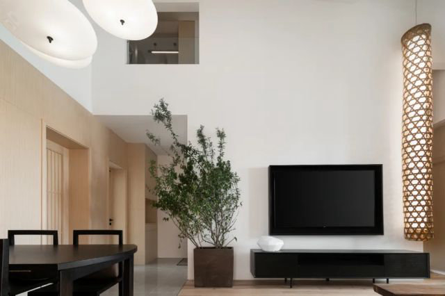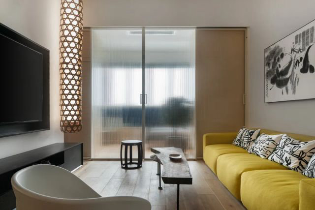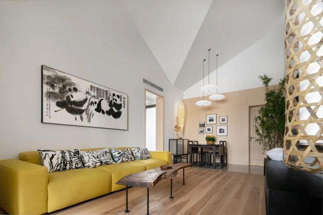“竹籠榪槎”是都江堰的代表符號,是我國古人智慧的結晶。設計師在原竹籠的基礎上進行再創作,并邀請當地非遺傳承人合作。為客廳設計了一款長3米的竹編可調光吊燈,美觀與實用價值兼顧。