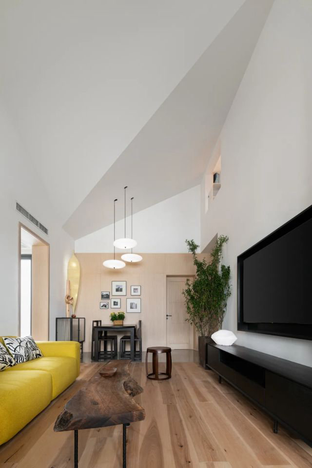 客廳和餐廳合二為一,使兩個空間相互借用,避免單個空間顯得擁擠。客廳因為讓出了小部分面積給小孩房,為了避免公共活動區域顯得狹小封閉,設計師選擇裸頂設計,屋頂增加保溫層,既隔熱,又滿足寬敞明亮的空間需求。