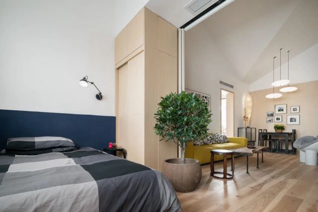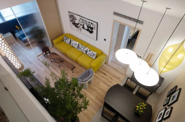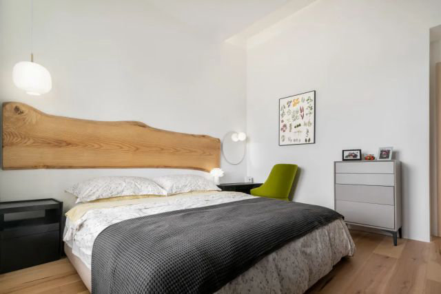 房內的兩個結構柱,設計師則利用衣柜的設計將其包裹在內,隔出了四個獨立的衣柜和鞋柜。男主人作為野生大熊貓的守護者,一家人都對熊貓有著特殊的感情。所以設計師專門采購了一組不同大小的丹麥瞇眼熊貓玩偶,委托中國傳統植物染手工藝人梅子,對玩偶進行重新染制并擺放在小孩房內。