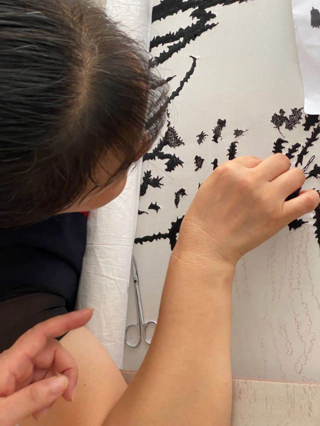 參照都江堰特有的植物設計了一系列抱枕圖案,選擇設計師家鄉蘇州的傳統絲綢和刺繡工藝,為主人家設計了一組獨一無二的絲綿抱枕。