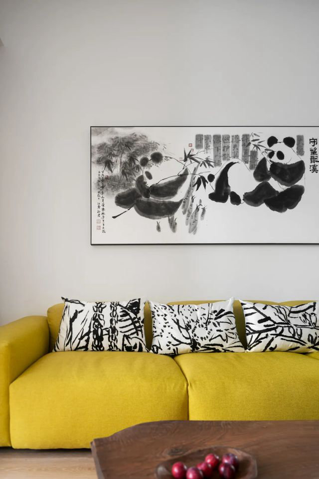 客廳沙發后的裝飾畫則是設計師邀請朋友孫君老師(中國著名的環保志愿者),為男主人畫了一副憨厚可掬的熊貓圖,上有題字:守望龍溪。