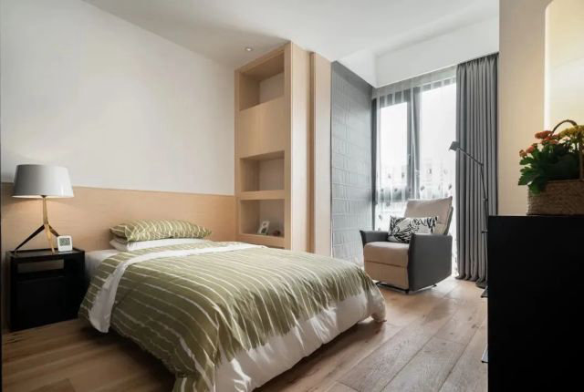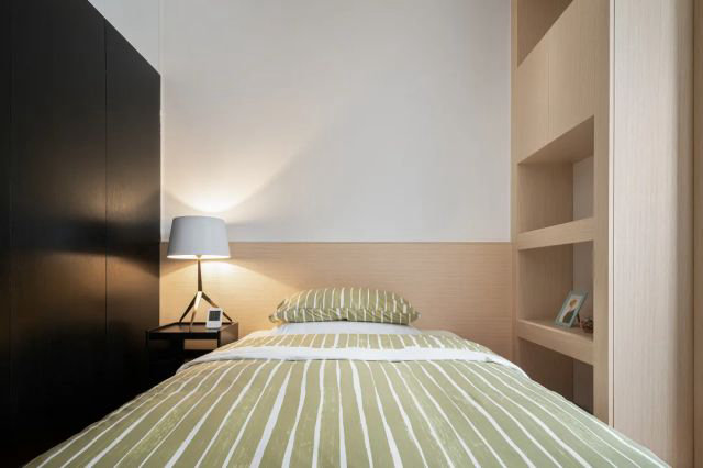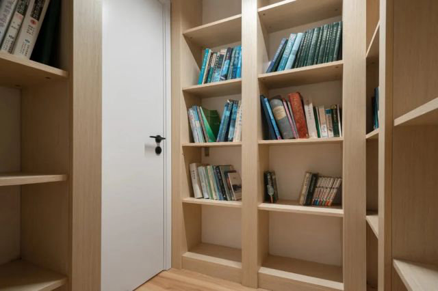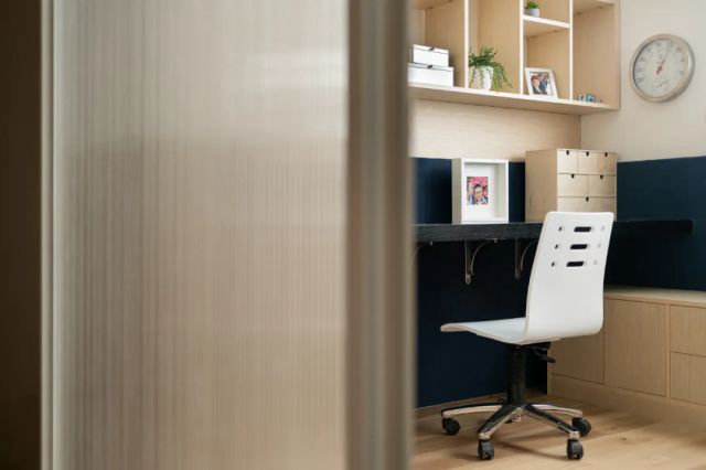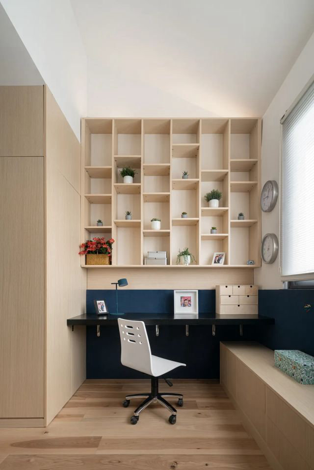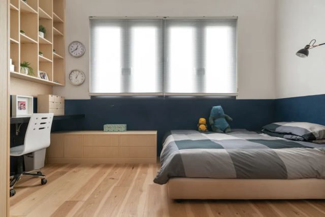 藏藍色的軟木墻裙特色鮮明,與客餐廳、夫妻房的自然風格形成鮮明的對比,半墻的書架滿足了學習的使用需求,充足的光照最先從室外照入這里,獨立的書桌、獨立的衣櫥,這里是獨屬于小孩的自由空間。