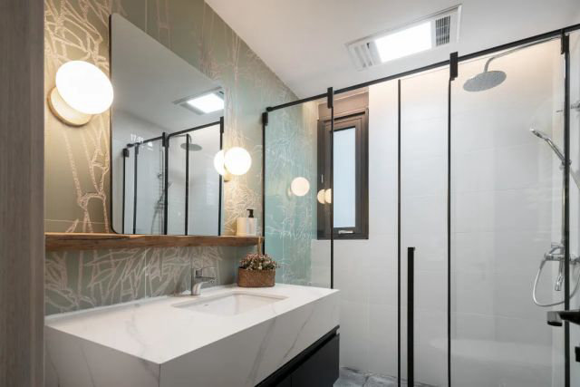 衛生間臺盆后的整面墻則是設計師請馬可波羅瓷磚博物館的瓷畫藝術家,專門雕刻了一副白描竹林圖。衛生間設置獨立的抽、排氣設備,配置帶烘干功能的毛巾架,加快水汽的蒸發。