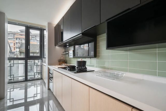 將小陽臺納入廚房使用空間,重新設計櫥柜,增大收納與置物空間。