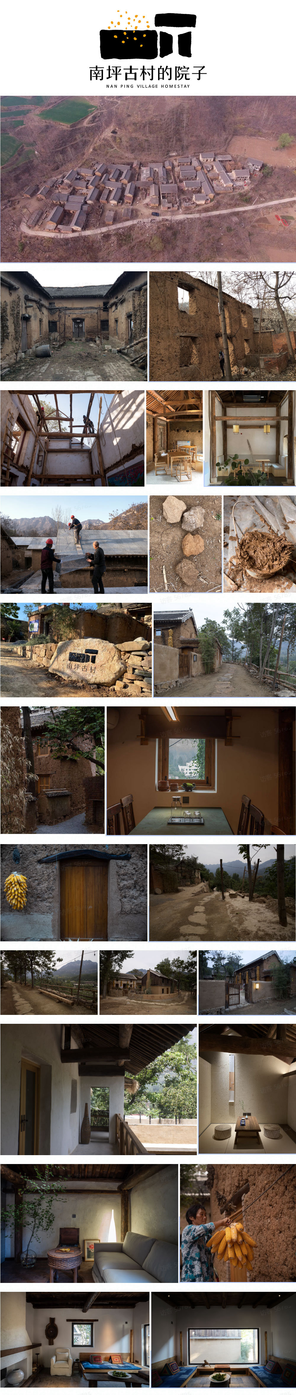 南坪村,典型的豫北古村落。位于愚公故里濟源市,太行山腹地,休閑度假的那些年小鎮內。建筑成組團狀分布,整體布局上較為獨立與分散,道路為泥巴路。村莊有17戶院落,建筑55棟,多為傳統兩層土坯房,無人居住、年久失修,破損嚴重。保護古村落,發展休閑度假業,繼承古村歷史風貌,衍生新的人文內容,是此項目的課題。